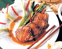 MALZEMELER (6-8 kişilik) * 500 gr hindi biftek * 8 dilim peynir * 2 soğan, 4 domates * 1 defne yaprağı * 3 yemek kaşığı un * 3 yemek kaşığı tereyağ * 1 çay bardağı karabiber * 4 adet patates, susam * 2 kaşık tereyağı, tuzot