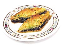 HAZIRLANIŞI Margarin ve nişasta hariç diğer malzemeden kulak memesi yumuşaklığında bir hamur yapın. Yarım saat kadar üzerini örterek dinlendirin. Sonra hamuru 20 eşit parçaya ayırın ve her birini yemek tabağı büyüklüğünde merdaneyle açın. Aralarını nişastalayarak, üst üste dizin. Hamurlar bittikten sonra, hepsini birden merdaneyle açın. Kare biçiminde kesin, uçlarına ceviz koyarak üçgen olacak şekilde katlayın (kenarlarını fazla bastırmayın). Tepsiye dizin, üzerine erittiğiniz margarini gezdirin ve ısıtılmış 180 derecelik fırında, kızarana kadar pişirin. Fırından alıp, hazırladığınız ılık şerbeti üzerine dökün.