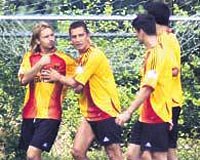 Koşuda tartışma çıktı Galatasaray'ın dün yapılan idmanı, gergin anlara sahne oldu. Koşu sırasında çıkan bir anlaşmazlık sonucu, Hakan Şükür'le Ayhan tartışmaya başladılar. İkili önce sözlü olarak tartıştıktan sonra birbirlerinin üzerine yürüdüler. Kavgada yumruklar konuşacakken araya giren Emre Aşık ikiliyi ayırdı ve arkadaşlarını sakinleştirmeye çalıştı. Heinz dün kampa katıldı Ayhan, kavga sonrasında "Böyle şeyler olabiliyor. Sorun değil" derken Hakan ise bu konuda herhangi bir açıklama yapmadı. Kavga sırasında müdahale etmeyen Gerets, otelde ise 2 oyuncuyu da uyardı. Öte yandan Çek Milli Takımı kadrosunda bulunan Marek Heinz dün akşam kampa katıldı.
